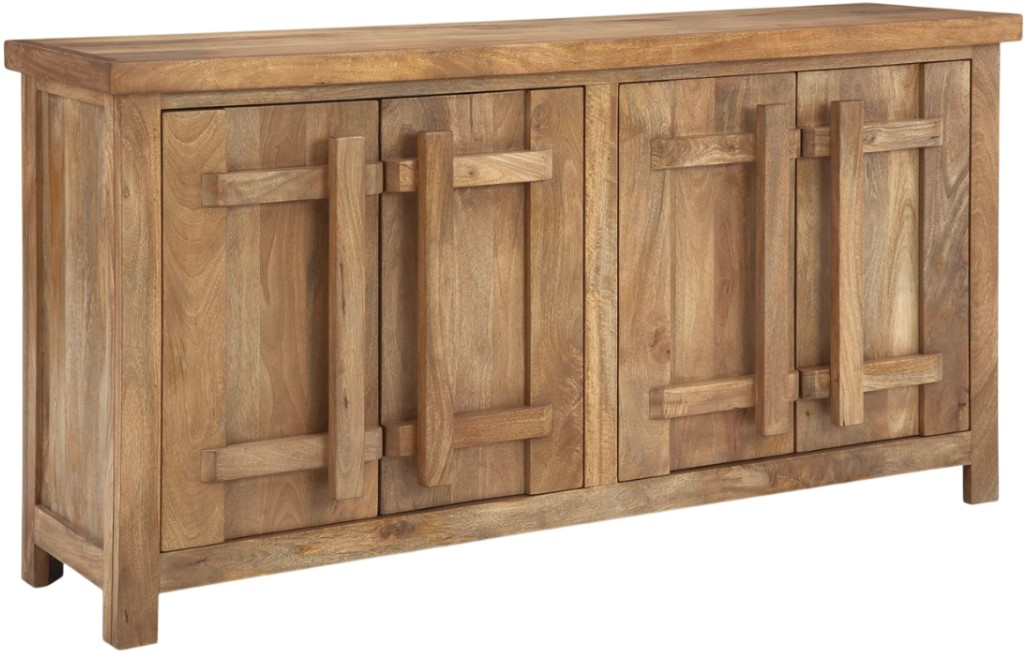 Fabriqué en bois de manguier massif et plaqué en finition naturelle.