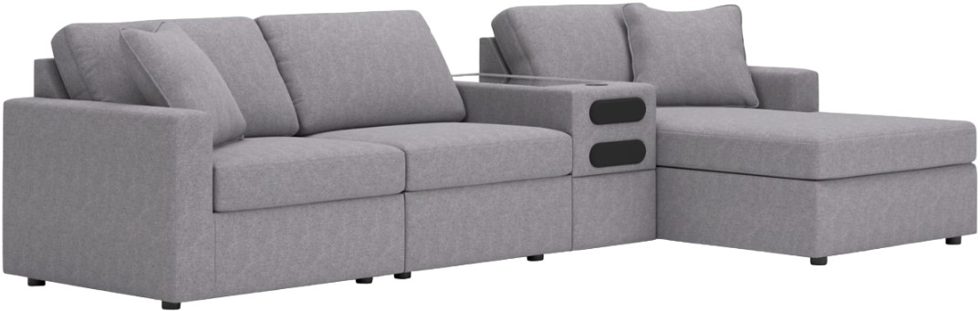 Comprend 4 éléments modulaires : fauteuil d'angle avec accoudoir gauche, fauteuil sans accoudoir, console audio avec rangement et chaise longue d'angle avec accoudoir droit.