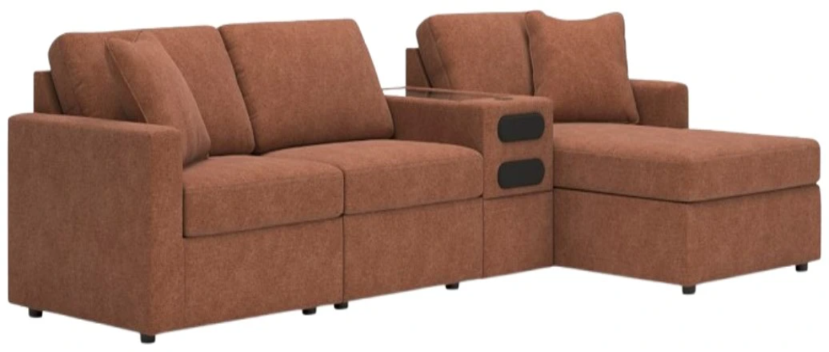 Comprend 4 éléments modulaires : fauteuil d'angle avec accoudoir gauche, console audio avec rangement, fauteuil sans accoudoirs et chaise longue d'angle avec accoudoir droit.
