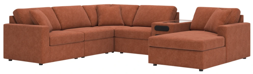 Comprend 6 éléments modulaires : fauteuil d'angle avec accoudoir gauche, console audio avec rangement, 2 fauteuils sans accoudoirs, coin et chaise longue d'angle avec accoudoir droit.