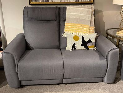 Causeuse Rikki inclinable motorisé avec appui-tête motorisé avec les assises en mousse mémoire, recouvert d'un tissu gris.Read More