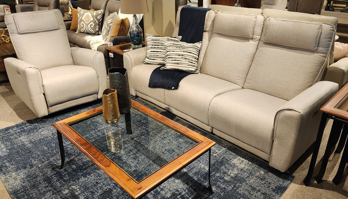 Ensemble de Salon Rikki comprend un sofa et un fauteuil berçant, pivotant, inclinable motorisé avec appui-tête motorisé avec les assises en mousse mémoire.Read More