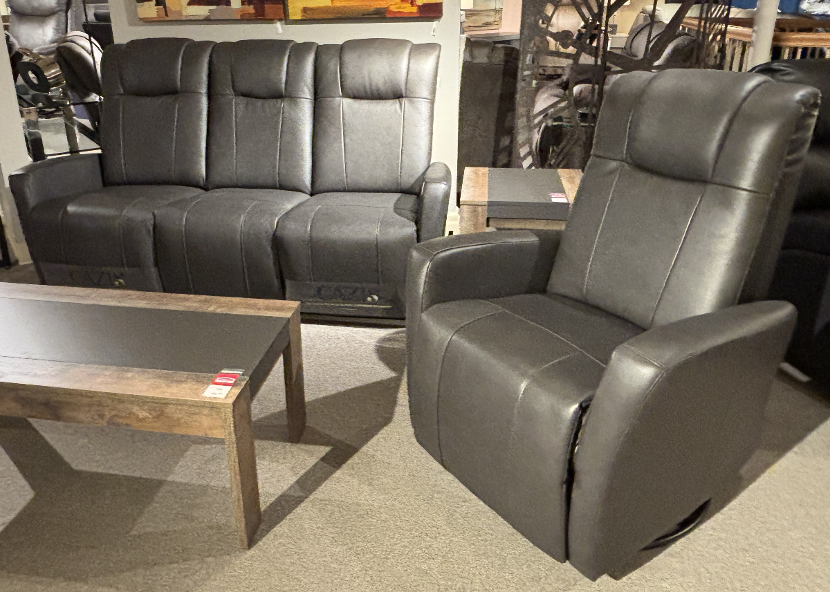 Ensemble de salon Valence de Cazis comprend un fauteuil berçant, pivotant, inclinable manuel et un sofa inclinable manuel en combo-cuir de couleur gris foncé.Read More
