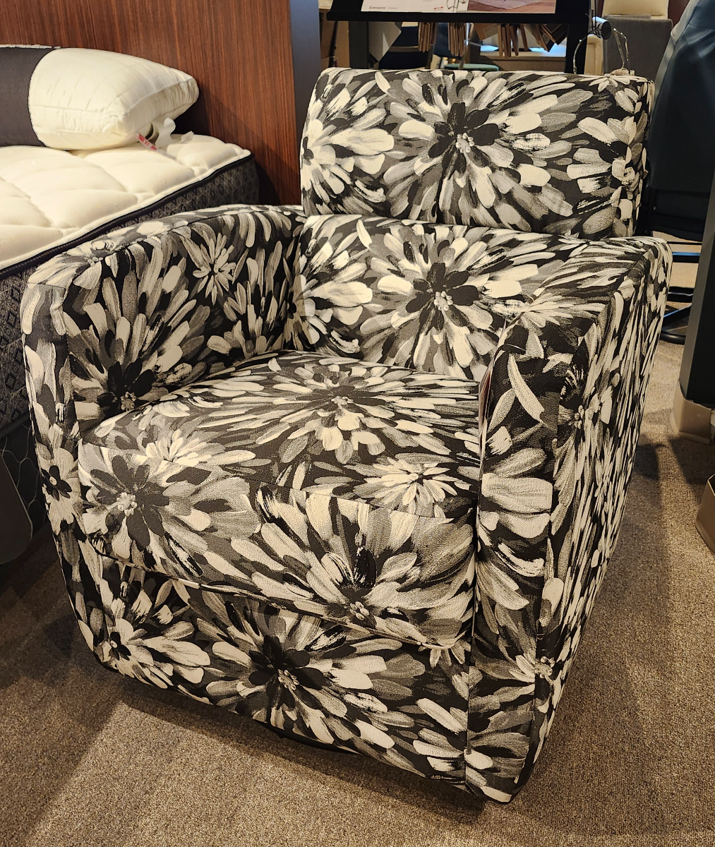 Fauteuil berçant et pivotant habillé d'un tissu à motif de fleur éclatant noir et blanc.Read More