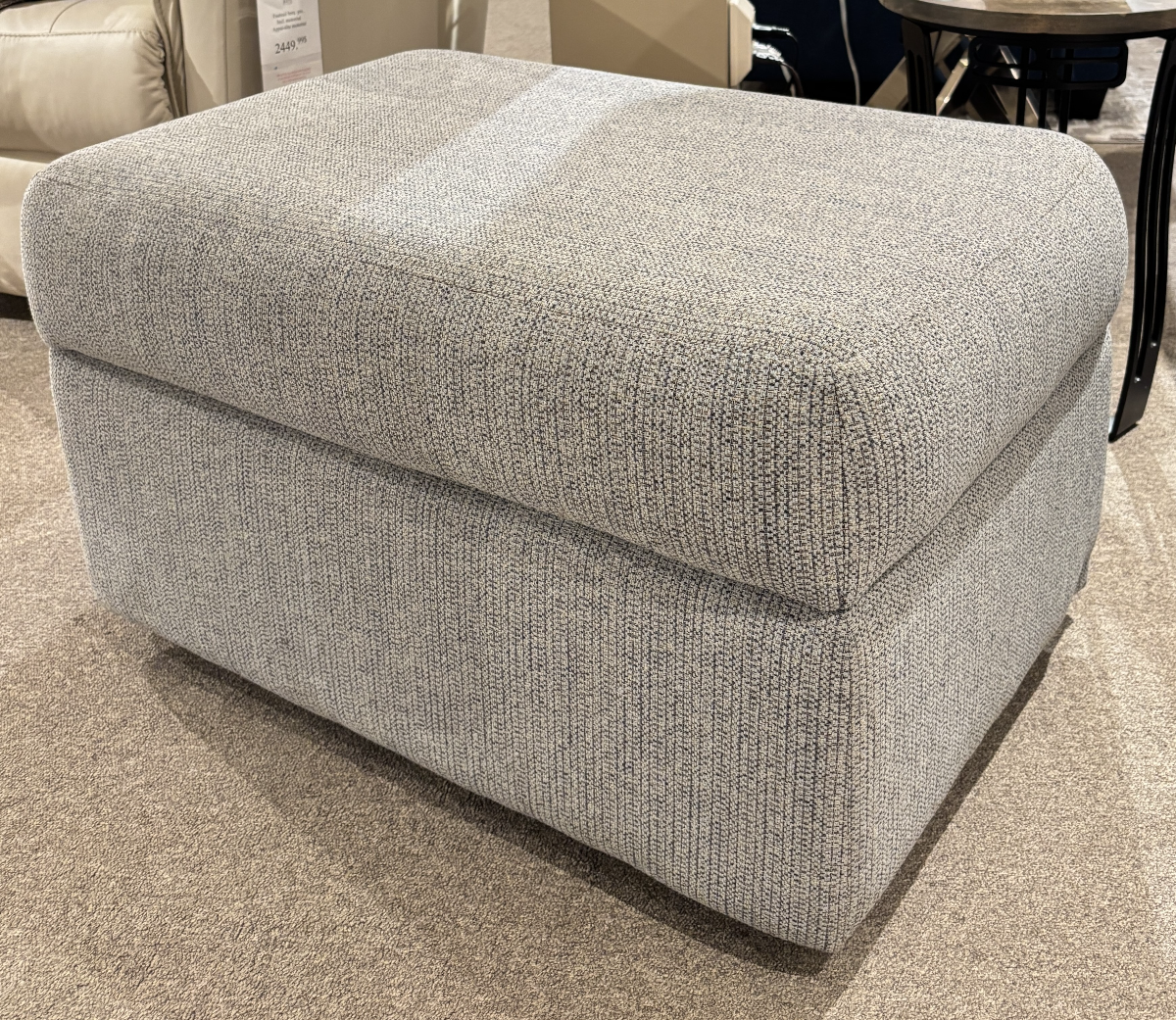 Ottoman Elran sur roulette avec rangement habillé d'un tissu gris bleu.Read More